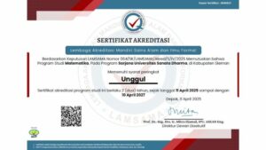 USD – Kamis, 17 April 2025, Program Studi Matematika Fakultas Sains dan Teknologi (FST) Universitas Sanata Dharma (USD) resmi meraih peringkat Akreditasi Unggul dari Lembaga Akreditasi Mandiri Sains Alam dan Ilmu Formal (LAMSAMA). Keputusan ini ditetapkan berdasarkan SK LAMSAMA Nomor 064/SK/LAMSAMA/Akred/S/IV/2025 yang ditandatangani oleh Direktur Dewan Eksekutif, Prof. Dr.-Ing. Drs. Ir. Mitra Djamal, IPU, ASEAN Eng. pada tanggal 11 April 2025 di Depok.