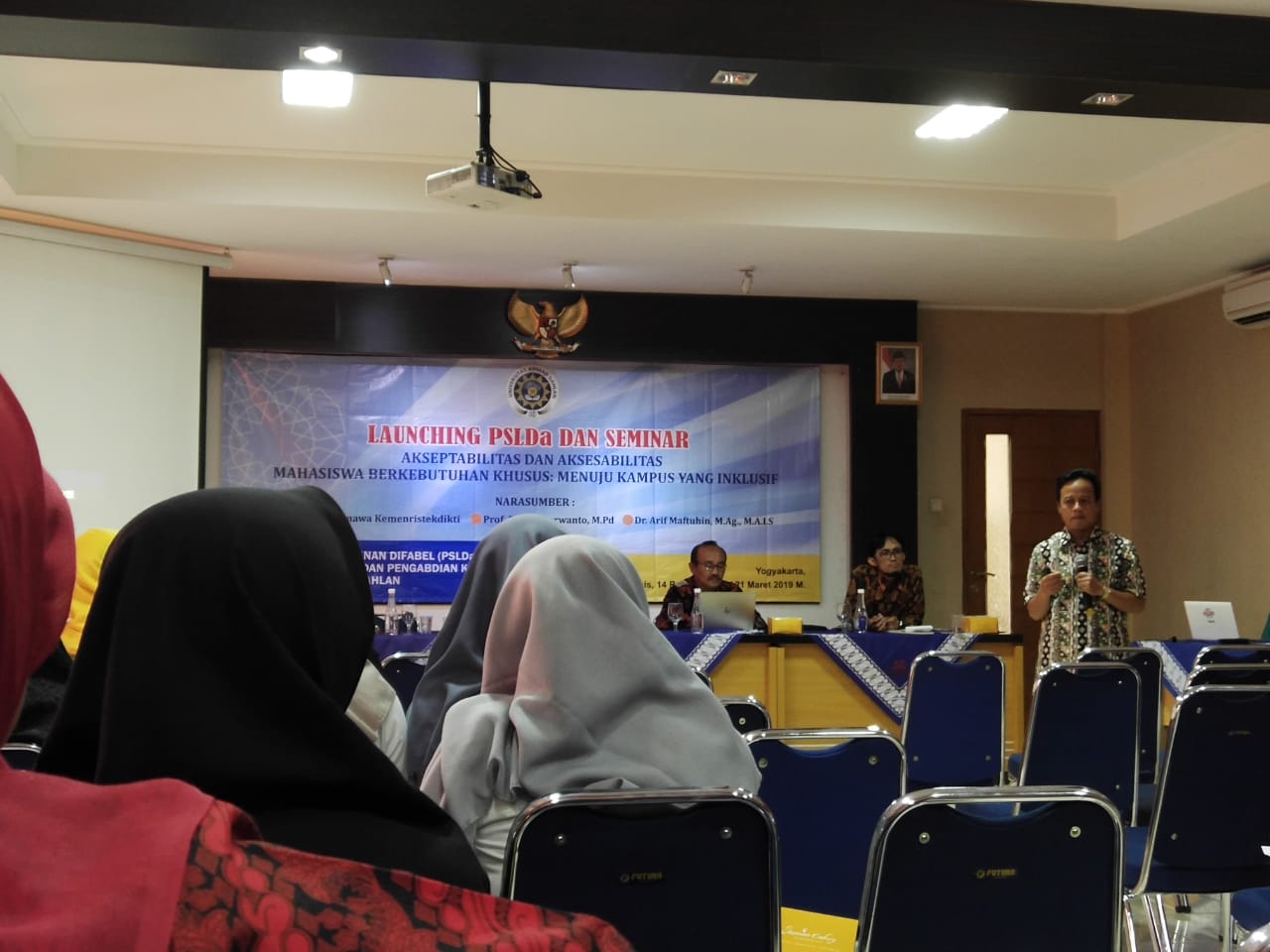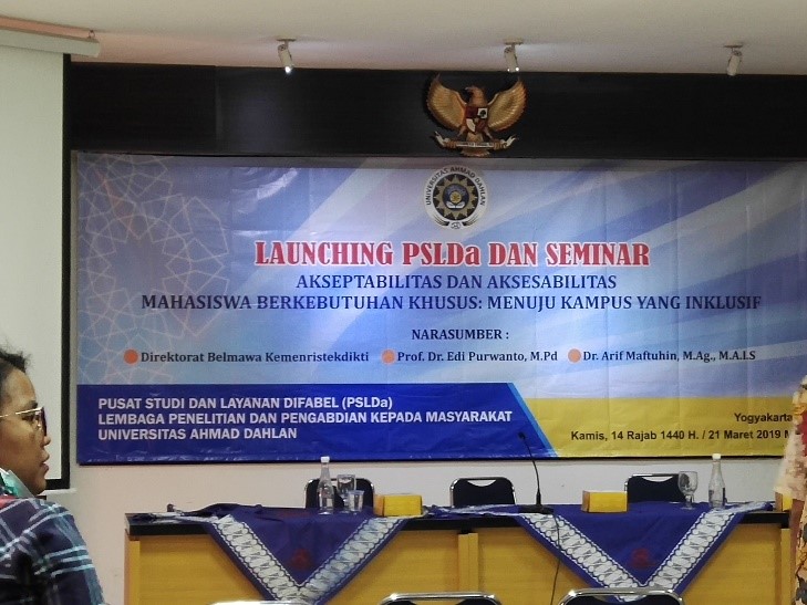 Seminar yang diadakan oleh Universitas Ahmad Dahlan (UAD) pada hari Kamis, 21 Maret 2019 bertempat di kampus 2B UAD. Seminar ini merupakan bagian dari rangkaian acara launching Pusat Studi dan Layanan Difabel di UAD. Pembicara yang dihadirkan dalam acara seminar ini adalah Prof. Dr. Edi Purwanto, M.Pd dan Dr. Arif Maftuhir,M.Ag.,M.A.I.S. Peserta yang hadir pada acara ini diantaranya adalah dosen-dosen dari berbagai universitas, mahasiswa dari berbagai perwakilan program studi yang ada di UAD dan berbagai undangan dari lembaga-lembaga di universitas yang memiliki visi dan misi yang sama yakni memperjuangkan hak teman-teman yang memiliki kebutuhan khusus. Adapun tema yang diangkat pada acara seminar ini adalah “Akseptabilitas dan Asesabilitas Mahasiswa Berkebutuhan Khusus: Menuju Kampus yang Inklusif”.