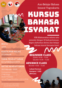Pusat Studi Individu Berkebutuhan Khusus, Universitas Sanata Dharma kembali membuka Kursus Bahasa Isyarat. Kursus terbuka bagi siapa saja yang berminat mempelajari Bahasa Isyarat.